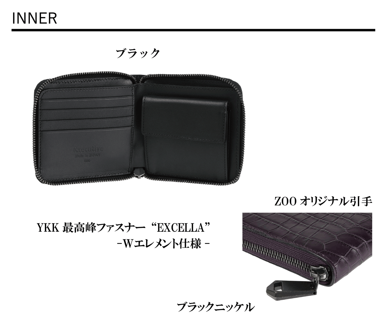 ファスナーは、YKK最高峰の”EXCELLA”-Wエレメント仕様-を採用しており、重厚感があり、開閉しやすい可動式の引手はZOOオリジナルでございます。