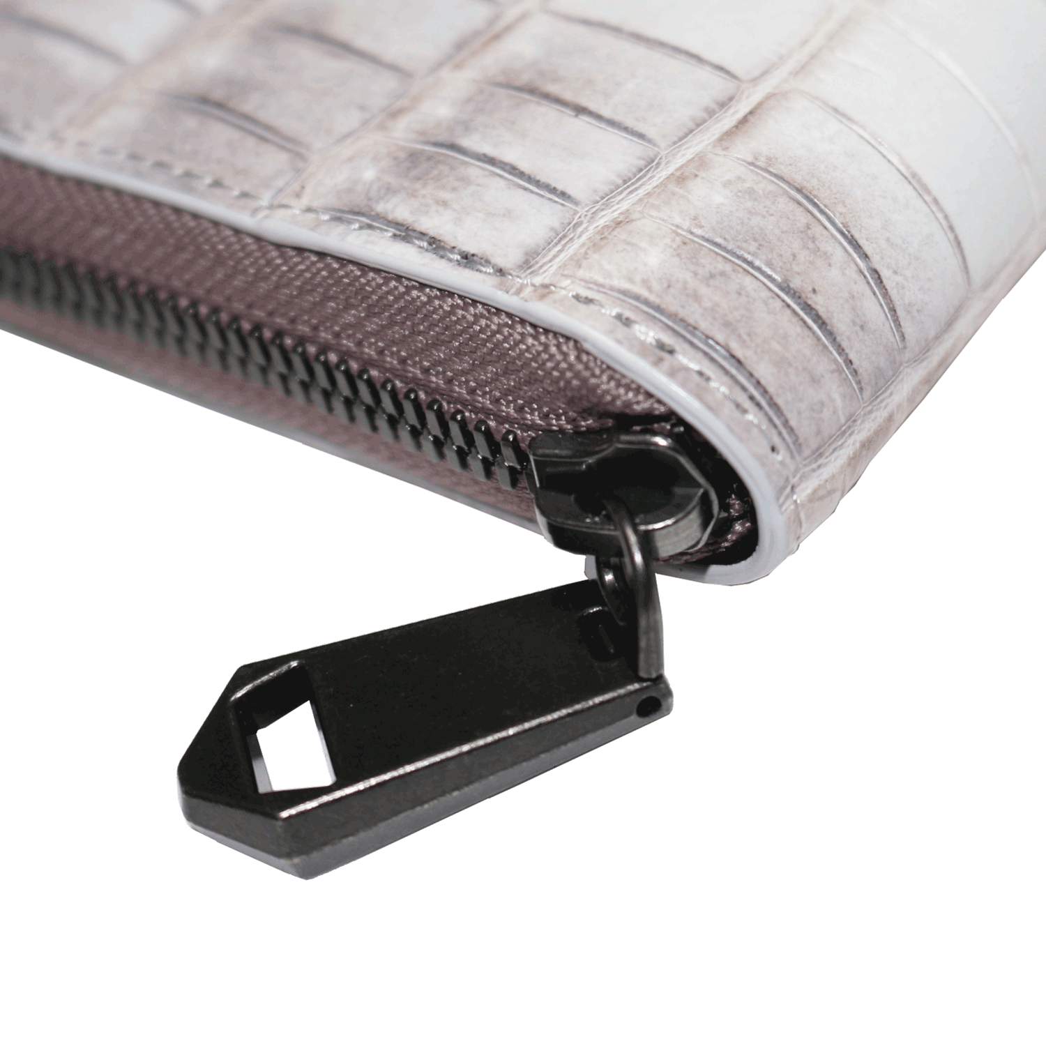 ホワイトからグレージュに移り変わるグラデーションが魅力的なヒマラヤクロコを使用した二つ折りラウンドウォレットです。