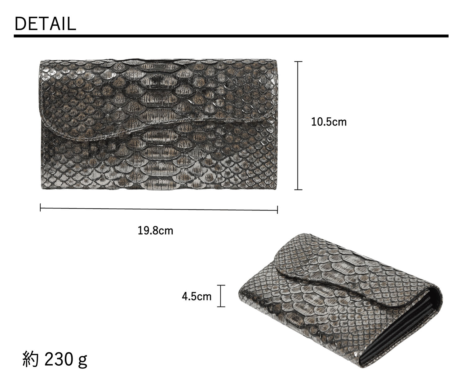 人気の高いパイソンレザーを深みのあるアンティーク調に仕上げたかぶせタイプのお財布です。
