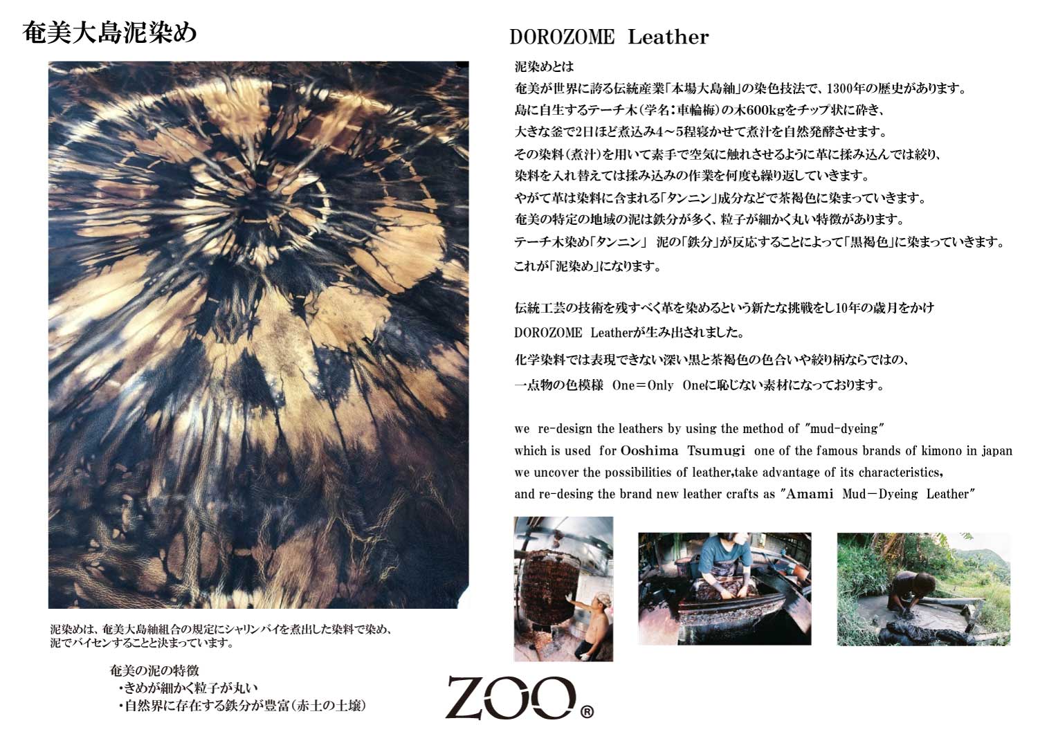 島に自生するテーチ木の煮汁と泥によって生み出され、化学染料では表現できない深い黒と茶褐色の色合いや、 絞り柄ならではの一点物の色模様が魅力です。