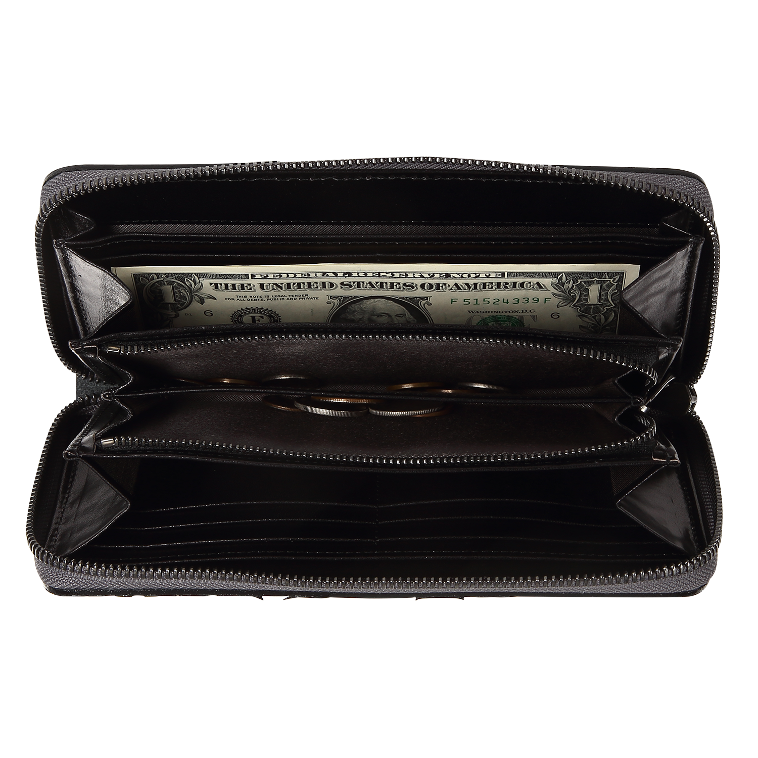 小銭入れのファスナーは下まで開き、中仕切りが有るので、硬貨も分けて収納する事も出来ます。