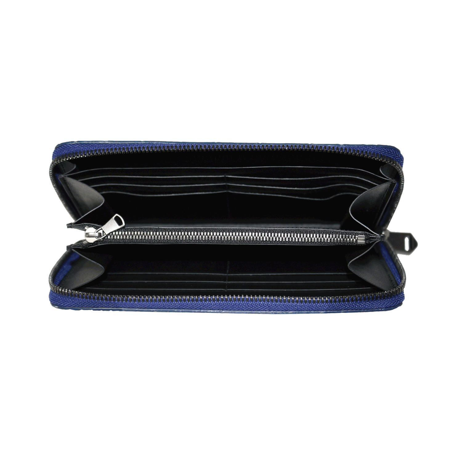 上品で深みのある風合いが魅力の藍染めクロコダイルを使用したラウンドウォレットです。