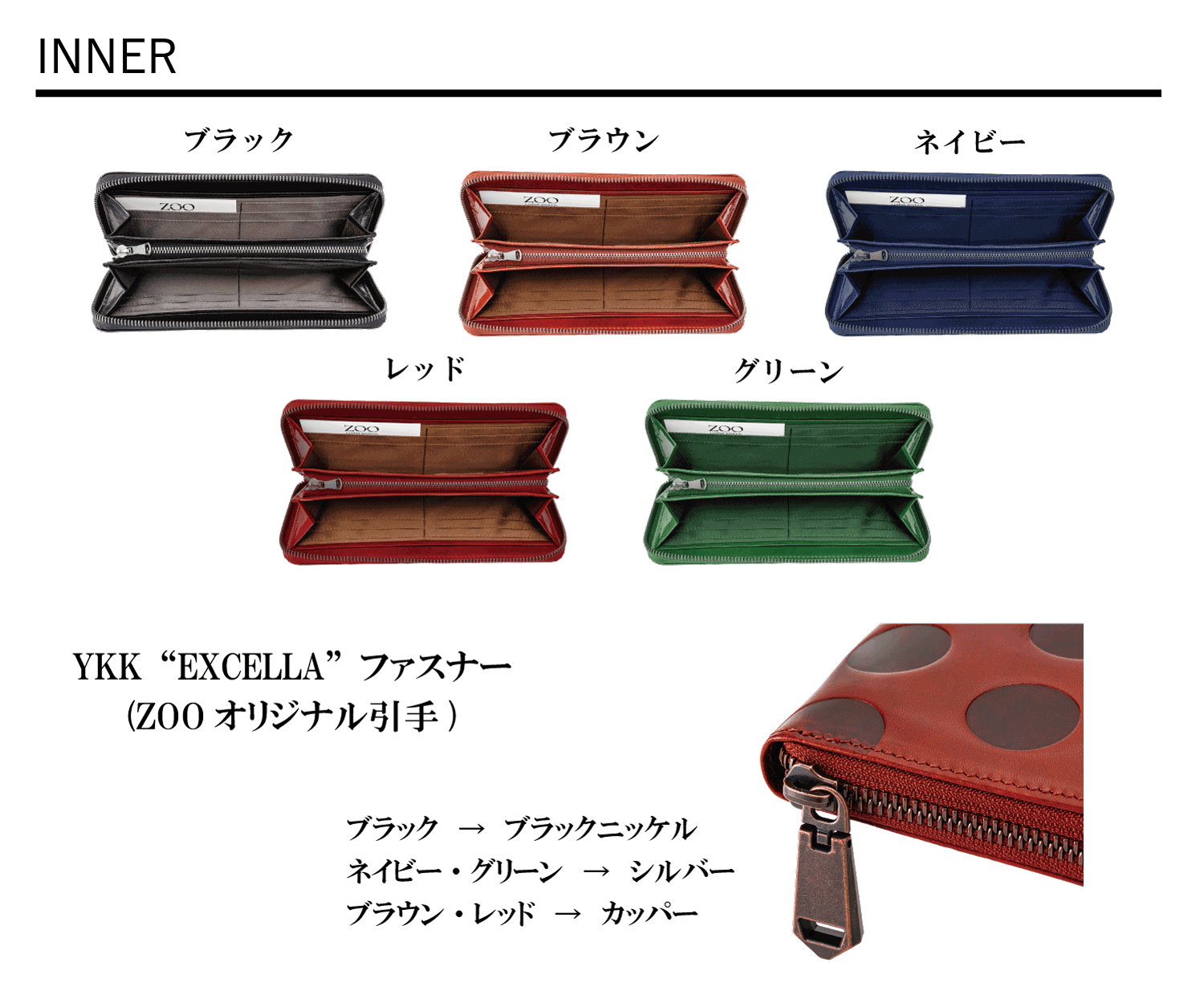 ファスナーはYKK社製最高峰の“EXCELLA”を使用しており、引手は外と内ともにZOOのオリジナルで外のファスナーは重厚感があり開閉しやすい可動式の引手となっております。